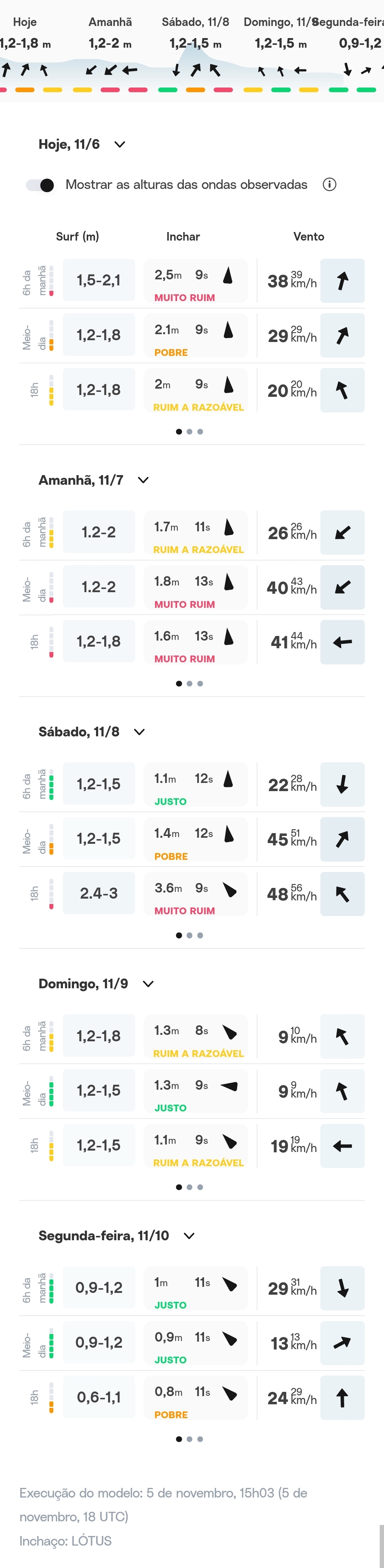TAMANHO: De acordo com os modelos, o período não será tão elevado e a ondulação vai ficar no patamar mediano. As ondas vão quebrar entre 1 metro com séries maiores chegando a um metro e meio e com picos ocasionais podendo chegar a 2 metros(4 a 6 pés variação no litoral).