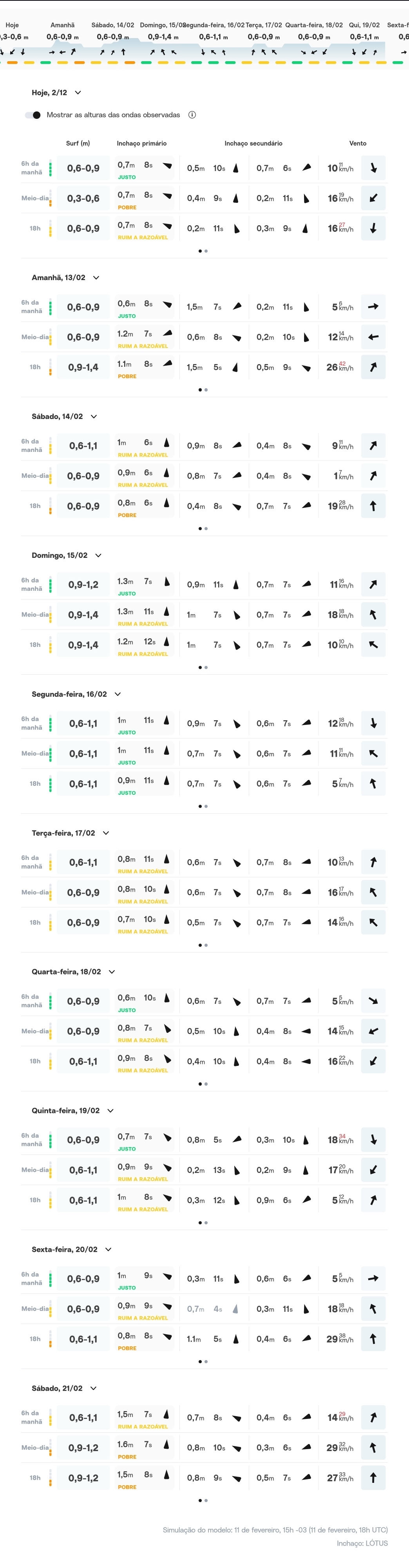 VENTOS: (12/02) O vento está fraco soprando fraco agora cedo de noroeste e o mar está com boa textura/terral. No decorrer da manhã vai se intensificar e a variação será entre norte a nordeste. Vai embalar até parte da sexta-feira e depois vai voltar para sul.
