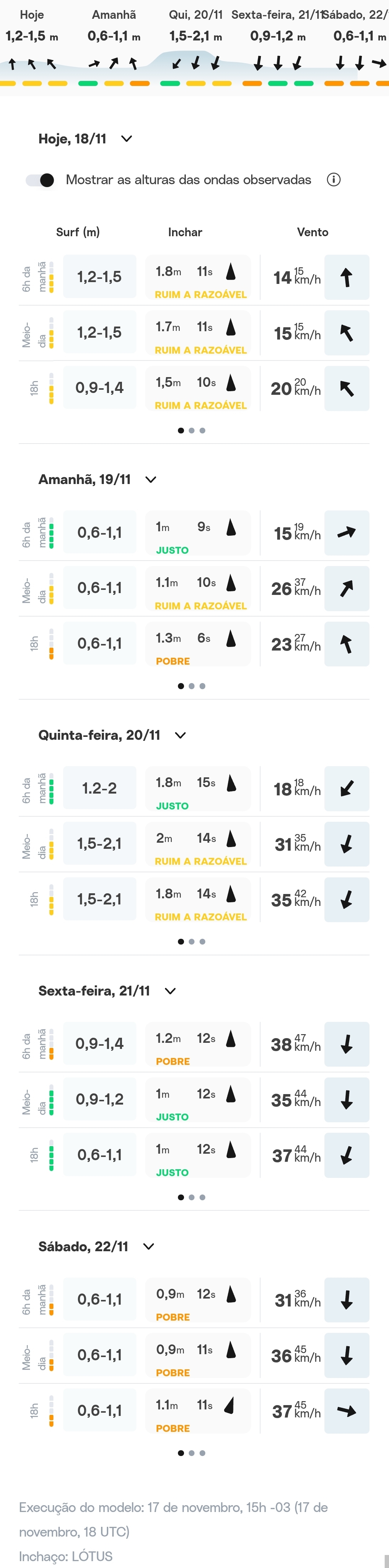 TAMANHO: De acordo com os modelos, a ondulação vai se manter com boa consistência a partir desta terça-feira em diante e as ondas vão quebrar entre meio a 1 metro com maiores. De quarta para a quinta-feira, as ondas vão reagir e poderão atingir 1 metro e meio com séries maiores.